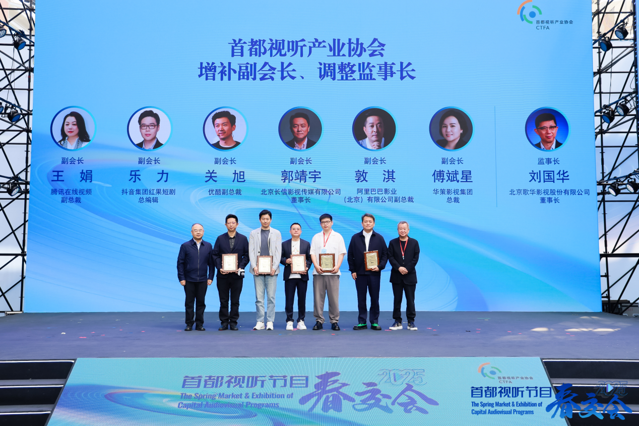 领导发言过后,张平公布了首都视听产业协会增补副会长、调整监事长的名单。本次增补副会长人员分别为腾讯在线视频副总裁王娟、抖音集团红果短剧总编辑乐力、优酷副总裁关旭、长信传媒董事长郭靖宇、阿里影业副总裁敦淇、华策影视集团总裁傅斌星,调整监事长为北京歌华影视董事长刘国华,名单公布后,大家纷纷上台合影留念。